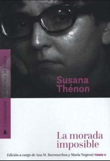 Susana Thénon (1935-1991) es una vox sola, una figura erguida entre el desasosiego y la ironía, una "distancia" urgente en la poesía argentina del siglo XX. Este libro reúne sus poemas publicados en libros hoy inconseguibles y una selección de sus textos inéditos. Abarca también su trabajo como fotógrafa y traductora e intenta rescatar algo de su pasión por la danza. Hemos incluido además cartas, ensayos y algunas notas breves y afiladas que la propia Susana Thénon escribió sobre el enigma de la poesía. Cumplimos así una deuda de amistad personal y una vieja complicidad tramada en esos "lugares extraños" del poema que no se pueden explicar pero sí comprender.La obra de Susana Thénon cruza la inutilidad del lenguaje para representar la existencia misma, de ahí un sentimiento de soledad, de nunca poder asentar el yo, un yo que no alcanza y se desordena en su afán de representar la figura del hablante, que se diluye inevitablemente. Todo esto se reúne en los dos tomos de La morada imposible, libro póstumo que recorre toda la producción artística de Susana Thénon.Ubicada, según su momento de creación poética, dentro de la denominada Generación del '60 en Argentina. Contemporánea a poetas como Juana Bignozzi (1937) y Alejandra Pizarnik (1936-1972), aunque no forma parte de ningún grupo literario se la suele afiliar con ambas por el tipo de construcción marginal que trabaja en su poesía, sin adherirse a ningún movimiento reinante en aquellos años.Como se deja entrever anteriormente, su relación con los demás poetas de su generación es casi nula, salvo excepciones como María Negroni, que después sería una de las compiladoras en sus libros póstumos (La Morada Imposible I y II) y la ya mencionada Alejandra Pizarnik, con la cual se frecuentaba, y junto con quien publicó en la Revista Literaria Agua Viva (1960), quizás una de sus pocas señales de apertura al medio.Existe un vacío en sus publicaciones entre 1970 y 1982, ya que se dedica activamente a la fotografía, aunque de todas formas continúa escribiendo.